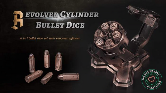 A tabletop statement set featuring six bullet-shaped dice and a revolver-style display rack!